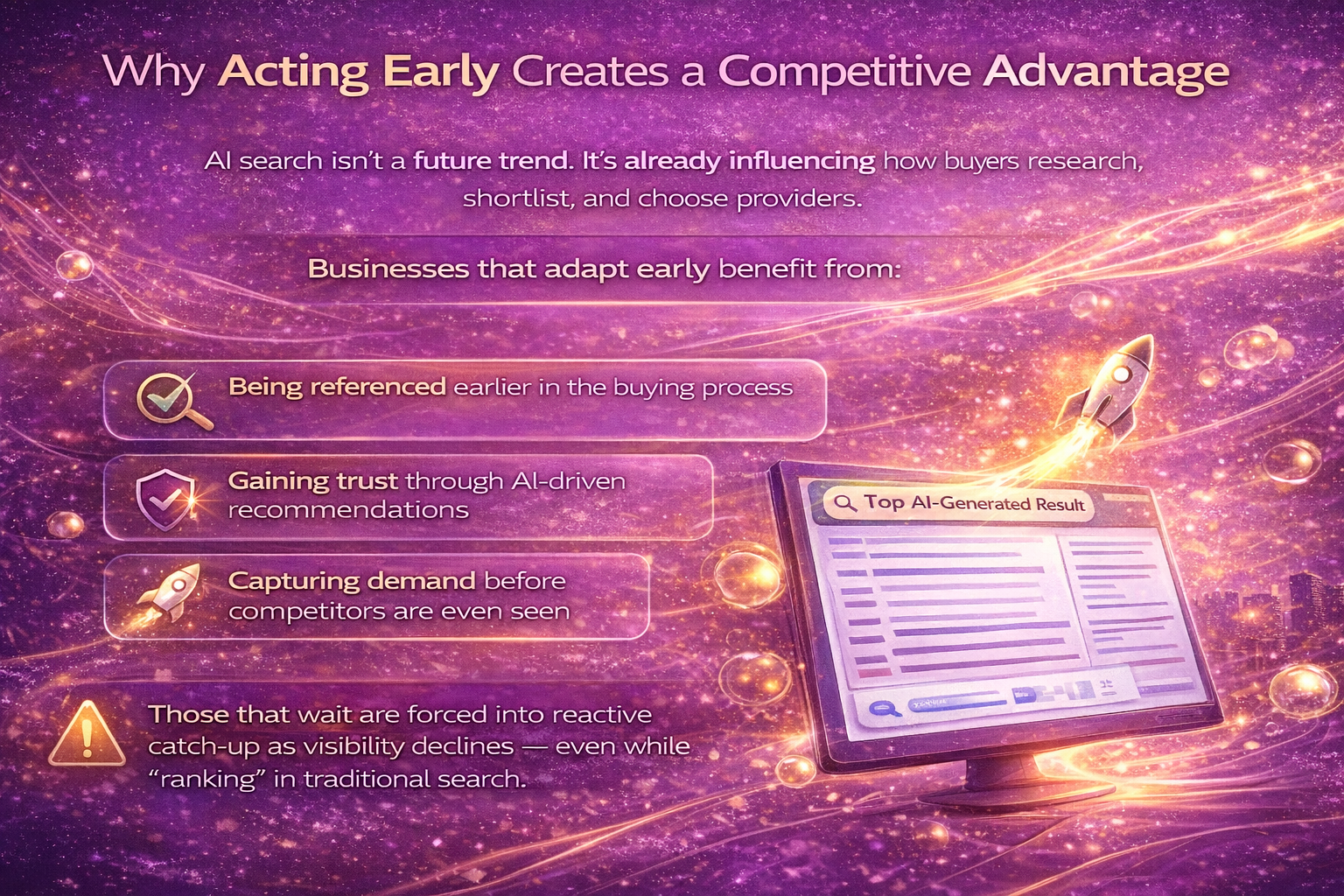 Those that wait are forced into reactive catch-up as visibility declines — even while “ranking” in traditional search.
