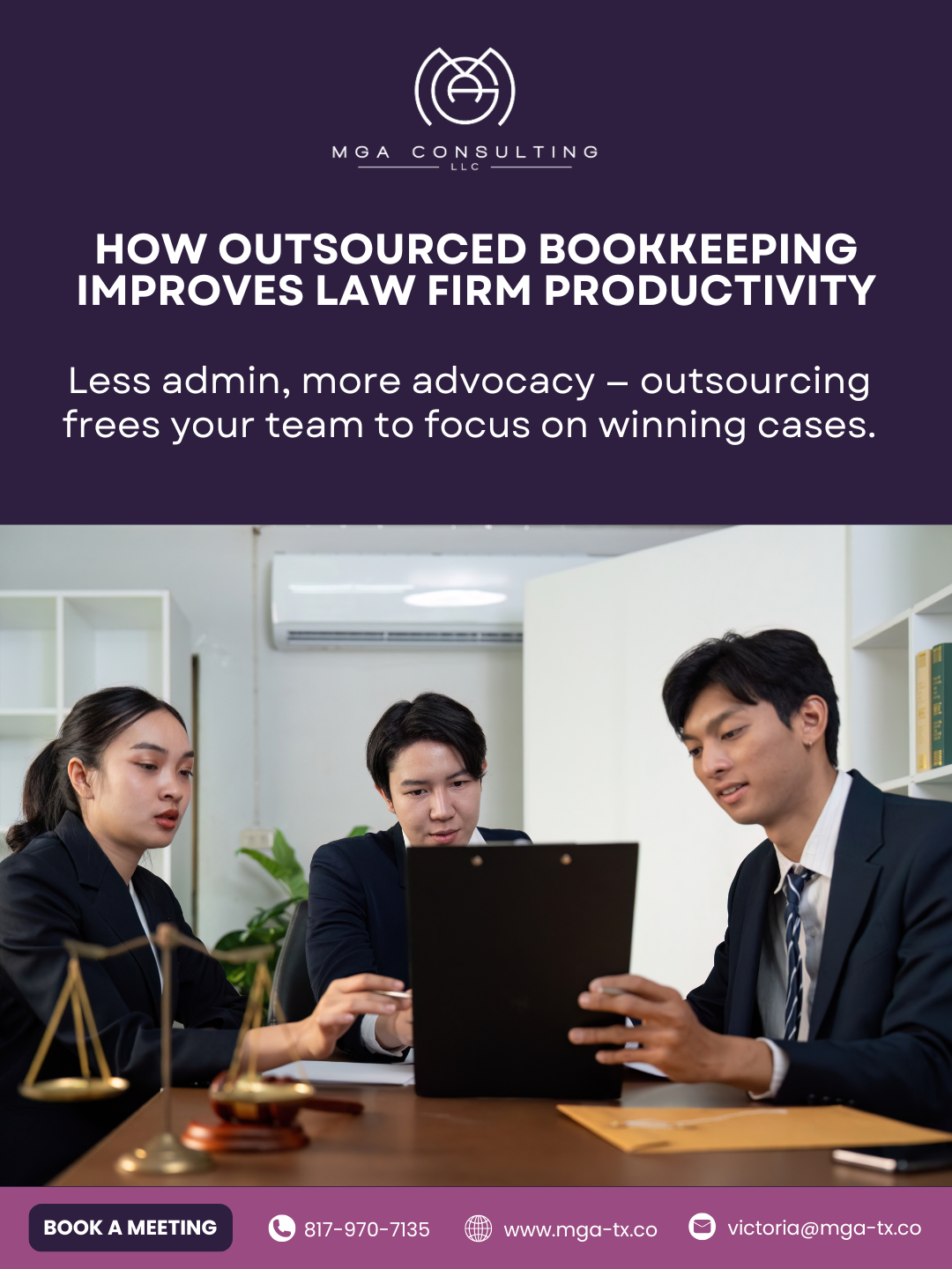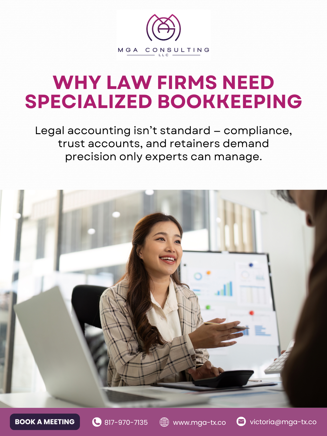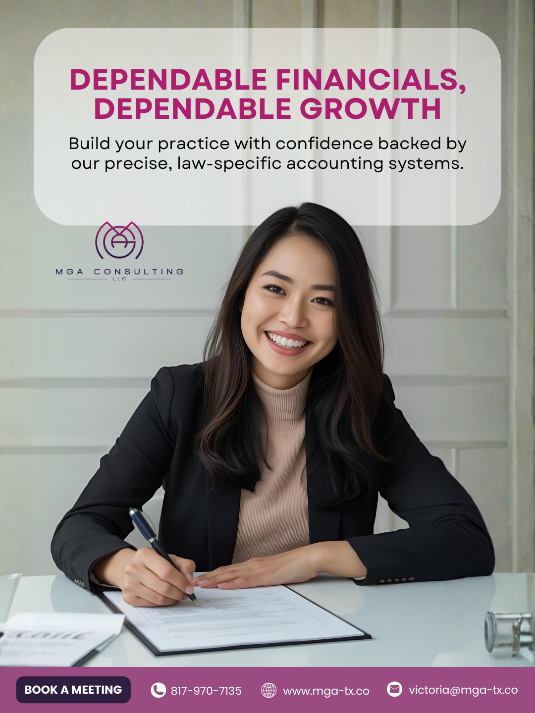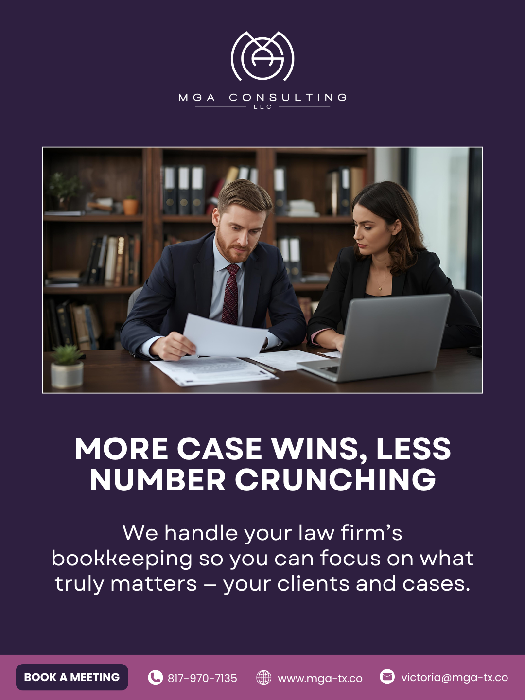 #MGAConsultingLLC #lawfirm #LawFirmBookkeeping #LegalFinance #TrustAccounting #IOLTACompliance #PayrollSolutionsForLawFirms #LawFirmGrowth #FinancialManagement #LegalIndustrySupport #BookkeepingExperts #LawPracticeEfficiency #LawFirmBackOffice #AccurateRecords #LawFirmFinances #ComplianceMadeEasy #LawFirmSupport