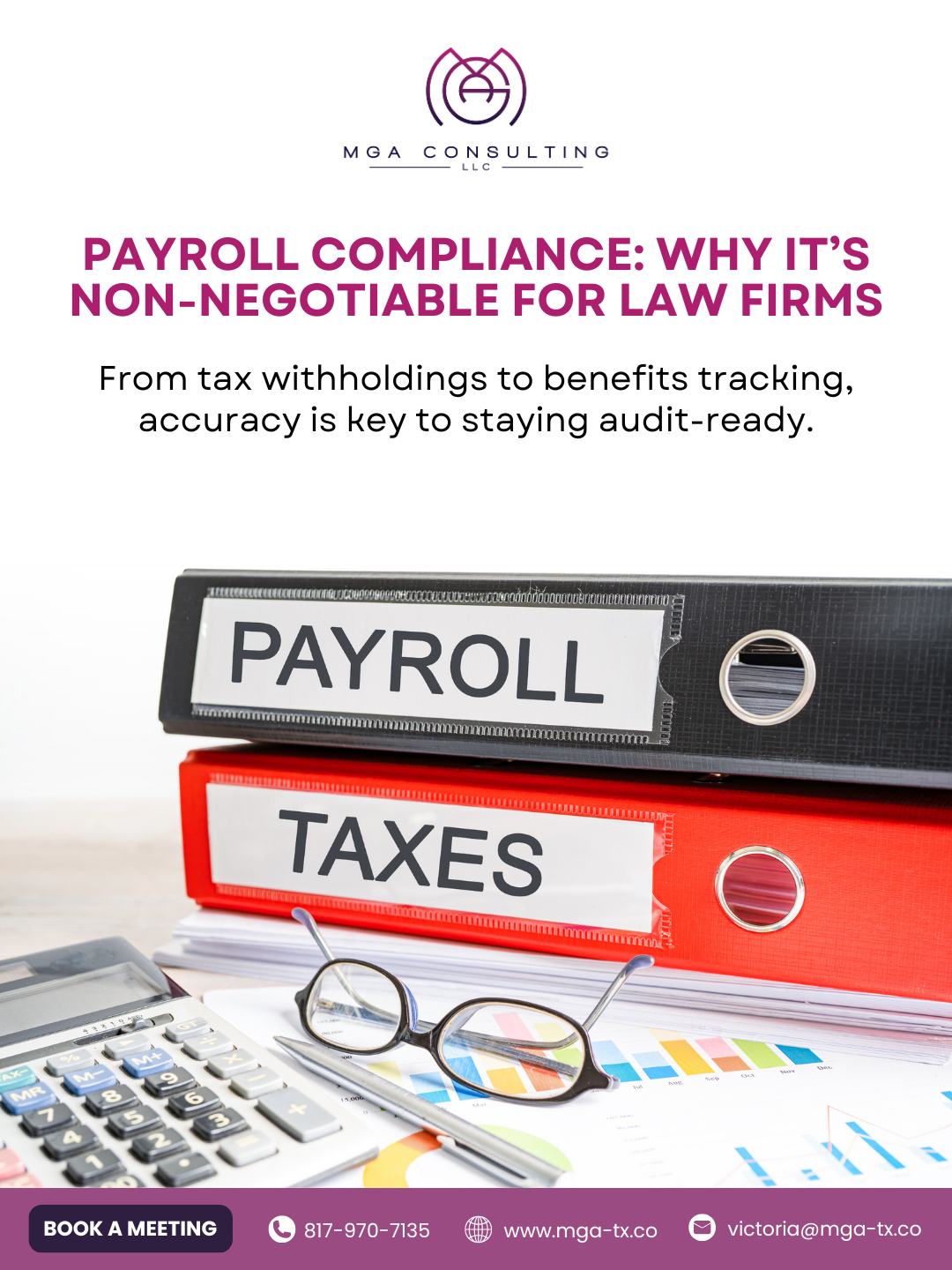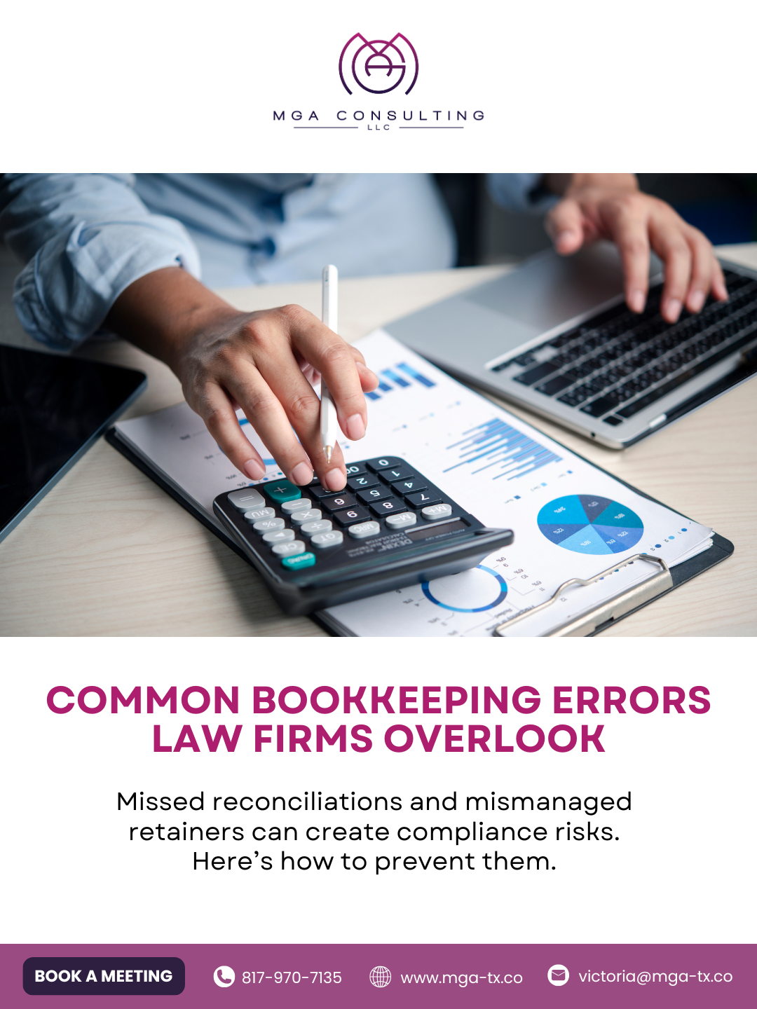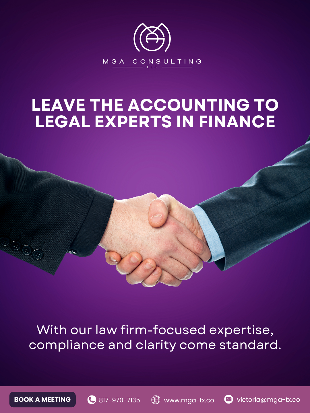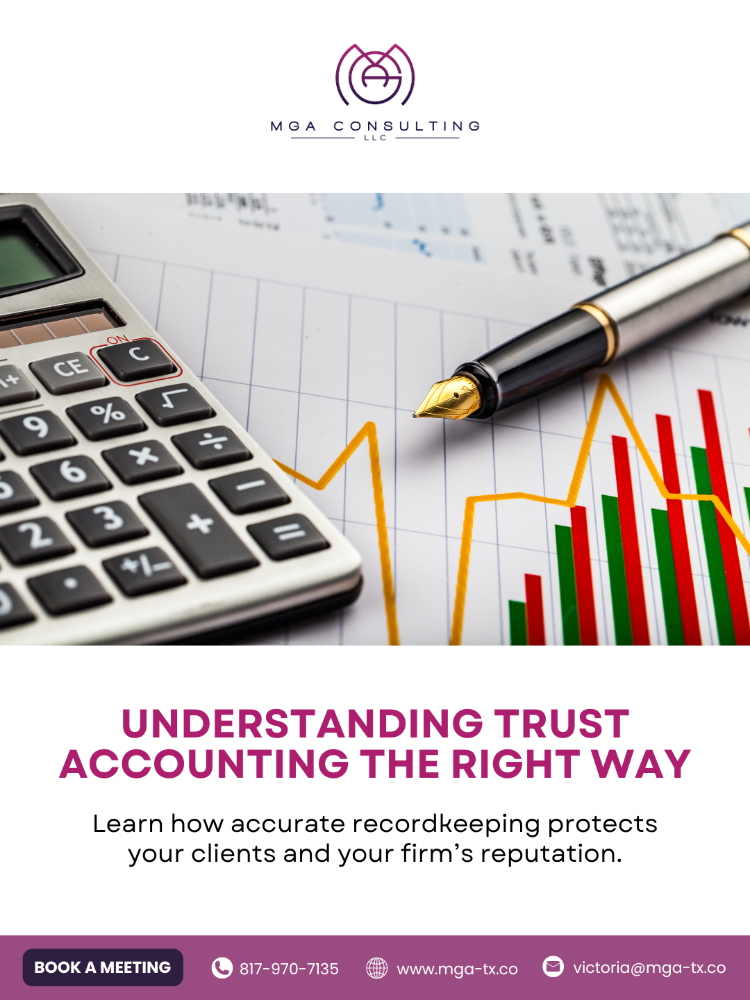 #MGAConsultingLLC #lawfirm #LawFirmBookkeeping #LegalFinance #TrustAccounting #IOLTACompliance #PayrollSolutionsForLawFirms #LawFirmGrowth #FinancialManagement #LegalIndustrySupport #BookkeepingExperts #LawPracticeEfficiency #LawFirmBackOffice #AccurateRecords #LawFirmFinances #ComplianceMadeEasy #LawFirmSupport