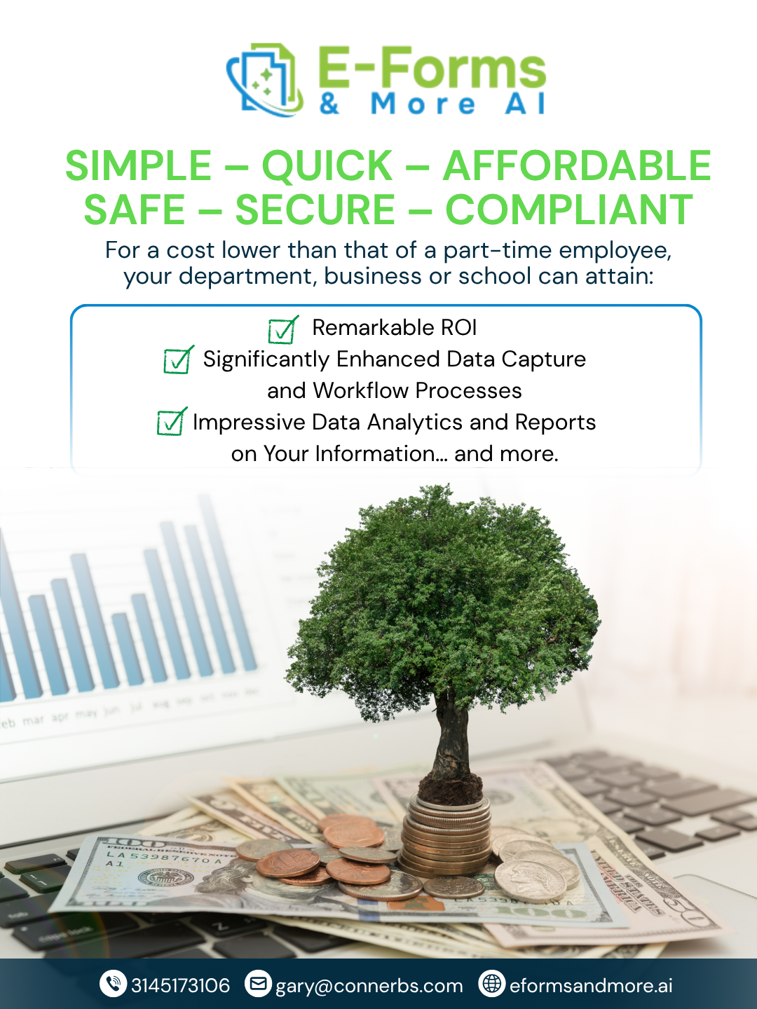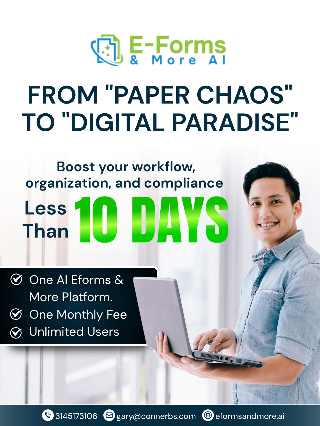 From rising staffing costs to hard-to-find data, the inefficiencies add up quickly. E-Forms & More A.I. provides an intuitive platform to manage every form with precision, security, and ease.