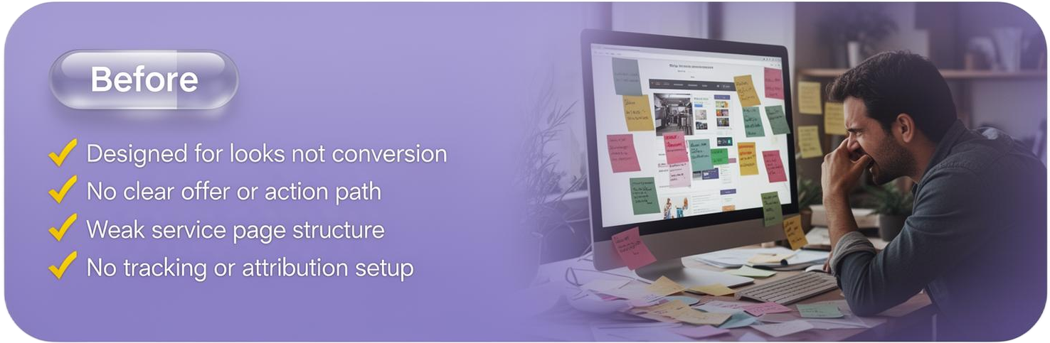 A conversion-focused website is designed to guide visitors toward a clear action such as booking a call, submitting a form, or requesting information. It prioritizes structured page architecture, strong calls to action, buyer-intent messaging, and measurable tracking instead of just visual design.